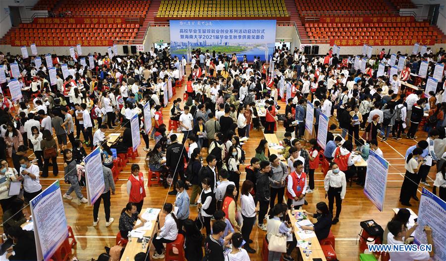 Job seekers attend a job fair in Haikou, south China's Hainan Province, Oct. 25, 2020. A job fair, which provided nearly 8,000 job vacancies, was held here on Sunday and attracted thousands of graduates. (Xinhua/Guo Cheng)