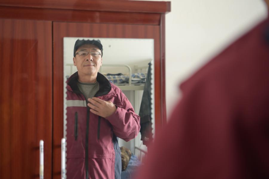 Wang Yi checks his uniform before going to work at the dorm in West Ujimqin Banner, north China's Inner Mongolia Autonomous Region, Oct. 21, 2020. (Xinhua/Li Zhipeng)