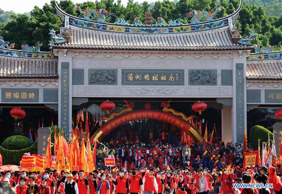Disciples and a statue of the Chinese sea goddess Mazu are seen in a parade around the Meizhou Island in Putian City, southeast China's Fujian Province, Oct. 25, 2020. In 2009, the Mazu belief and customs were inscribed on the UNESCO Representative List of the Intangible Cultural Heritage of Humanity. (Xinhua/Wei Peiquan)