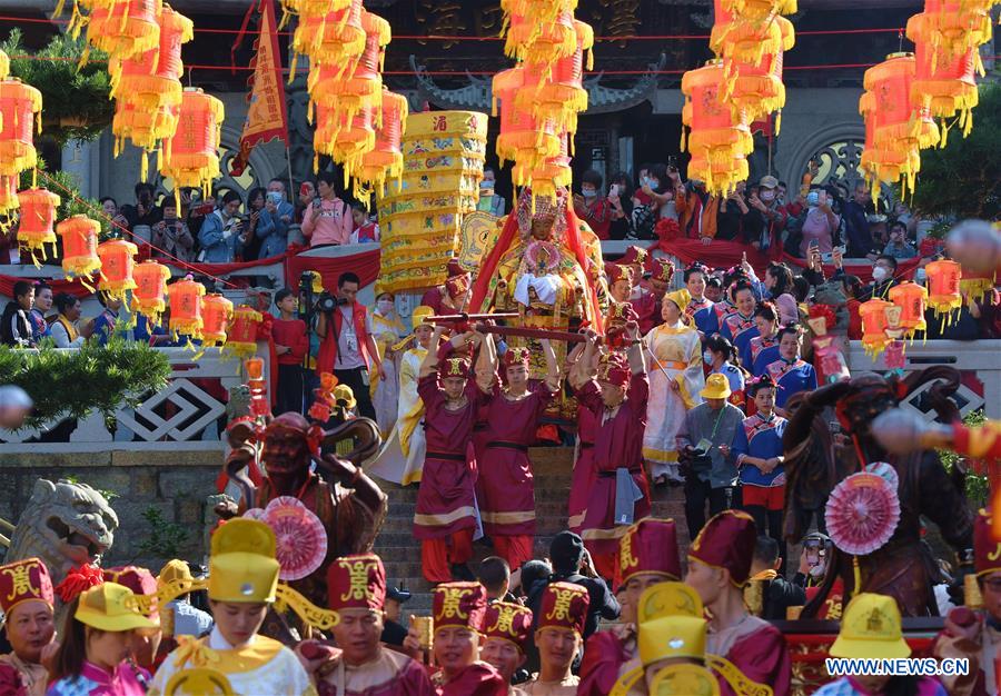 A statue of the Chinese sea goddess Mazu is lifted for a parade around the Meizhou Island in Putian City, southeast China's Fujian Province, Oct. 25, 2020. In 2009, the Mazu belief and customs were inscribed on the UNESCO Representative List of the Intangible Cultural Heritage of Humanity. (Xinhua/Wei Peiquan)