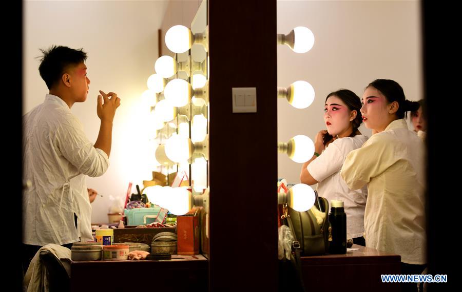 Actors make up backstage in a theatre in Shijiazhuang, capital of north China's Hebei Province, Oct. 24, 2020. A series of performances lasting for a week will put on stage in Shijiazhuang to celebrate the Chongyang Festival for the elders. (Photo by Chen Qibao/Xinhua)