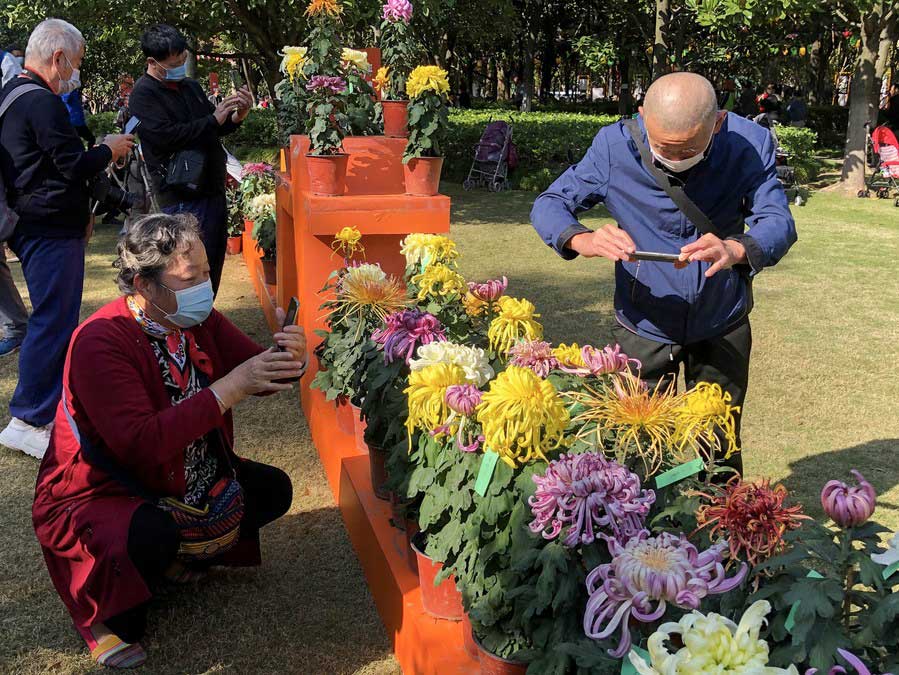 Elder people enjoy flowers at a park in Shanghai, east China, Oct. 25, 2020. (Xinhua/Huang Anqi)