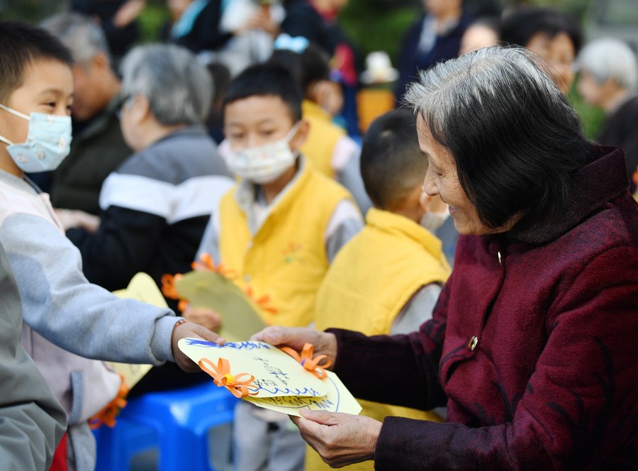Kindergarten children present greeting cards to the elderly at a community in Xi'an, northwest China's Shaanxi Province, Oct. 23, 2020. (Xinhua/Zhang Bowen)