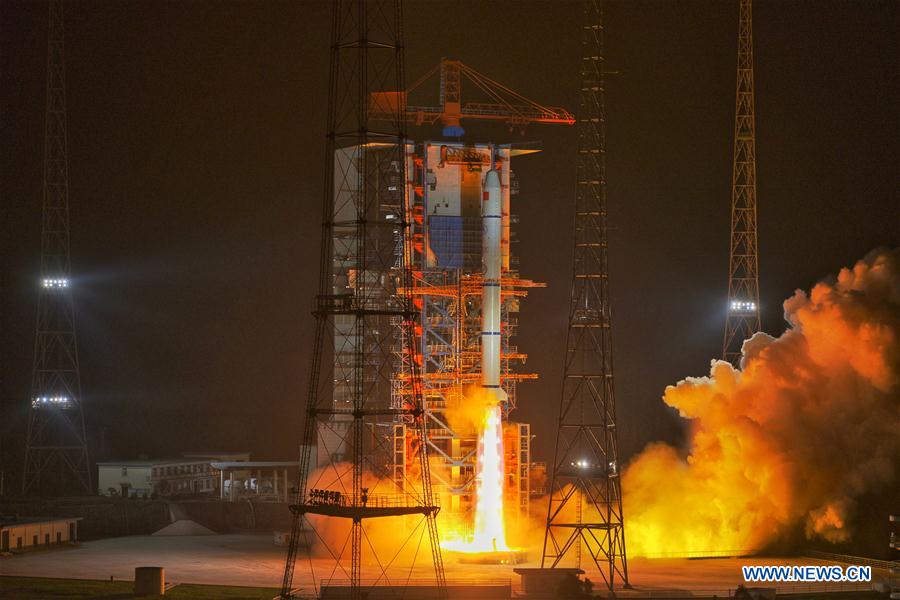 A Long March-2C carrier rocket blasts off from the Xichang Satellite Launch Center in southwest China's Sichuan Province on Oct. 26, 2020. China successfully sent a group of new remote-sensing satellites into orbit from the Xichang Satellite Launch Center in southwest China's Sichuan Province on Monday. Belonging to the Yaogan-30 family, the satellites were launched by a Long March-2C carrier rocket at 11:19 p.m. (Beijing Time). (Photo by Guo Wenbin/Xinhua)