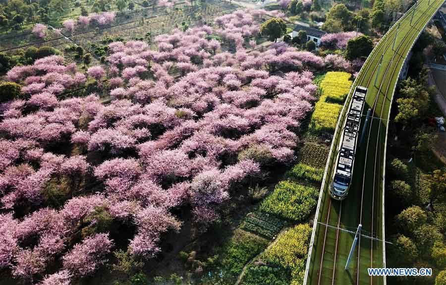 A tramcar runs past begonia flowers in Suzhou, east China's Jiangsu Province, March 28, 2018. (Photo by Xu Zhiqiang/Xinhua)
