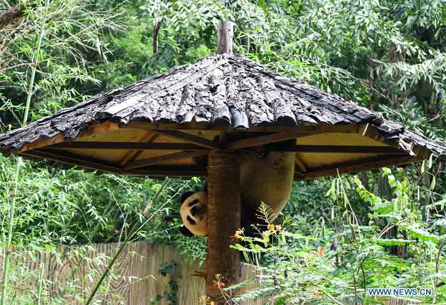 Giant panda Gonggong plays outside at Hainan Tropical Wildlife Park and Botanical Garden in Haikou, capital city of south China's Hainan Province, Oct. 26, 2020. (Xinhua/Yang Guanyu)
