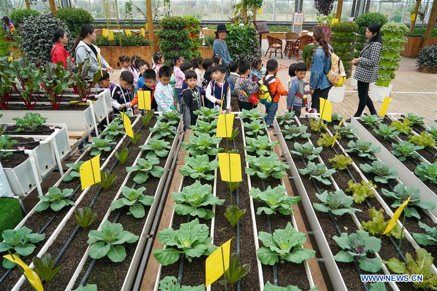 A group of children visit a modern agricultural industry park in Tongshan District, Xuzhou, east China's Jiangsu Province, Oct. 27, 2020. Authorities in Tongshan District have taken steps to optimize the local agricultural sector by combining modern agriculture with urban tourism. Altogether, the district's 300-plus agritourism parks have received some four million visitors in 2019. (Xinhua/Li Bo)