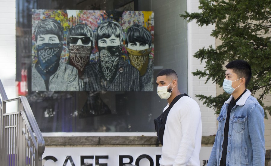 People wearing face masks walk past a gallery in Toronto, Canada, on Oct. 23, 2020. (Photo by Zou Zheng/Xinhua)