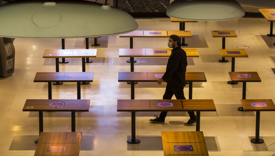 A man wearing a face mask walks through a closed dining area of a food court in Toronto, Canada, on Oct. 19, 2020. (Photo by Zou Zheng/Xinhua)