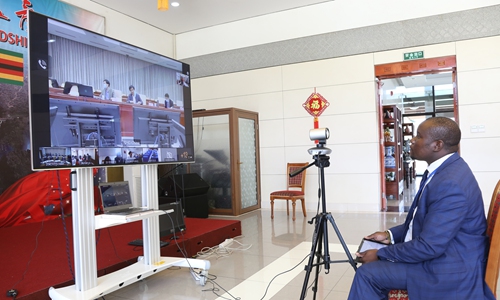 Doctors from Zimbabwe have a video conference with Chinese doctors to exchange experience of fighting the COVID-19 on March 18. [Photo/Xinhua]