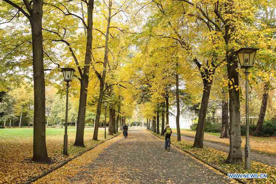 Two cyclists are seen at a park in Berlin, capital of Germany, Oct. 28, 2020. (Xinhua/Shan Yuqi)