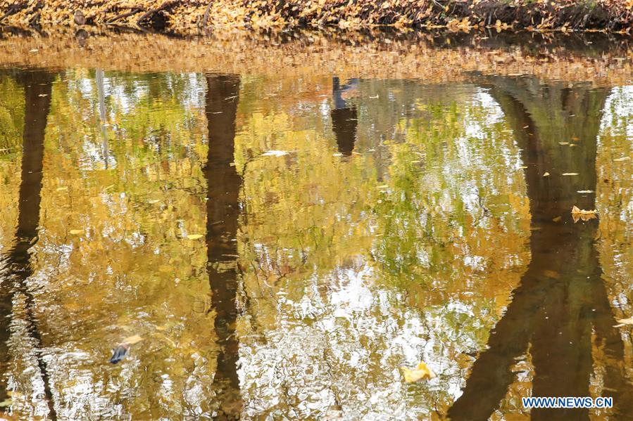 A pedestrian is reflected in a river at a park in Berlin, capital of Germany, Oct. 28, 2020. (Xinhua/Shan Yuqi)