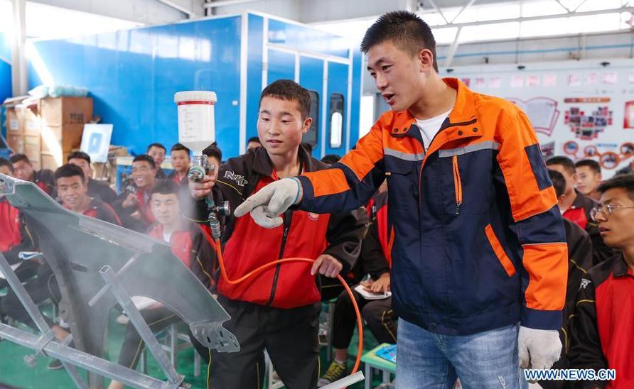 Students have a training class on auto repairing at a vocational school in Xiji County, northwest China's Ningxia Hui Autonomous Region, Sept. 16, 2020. (Xinhua/Yang Zhisen)