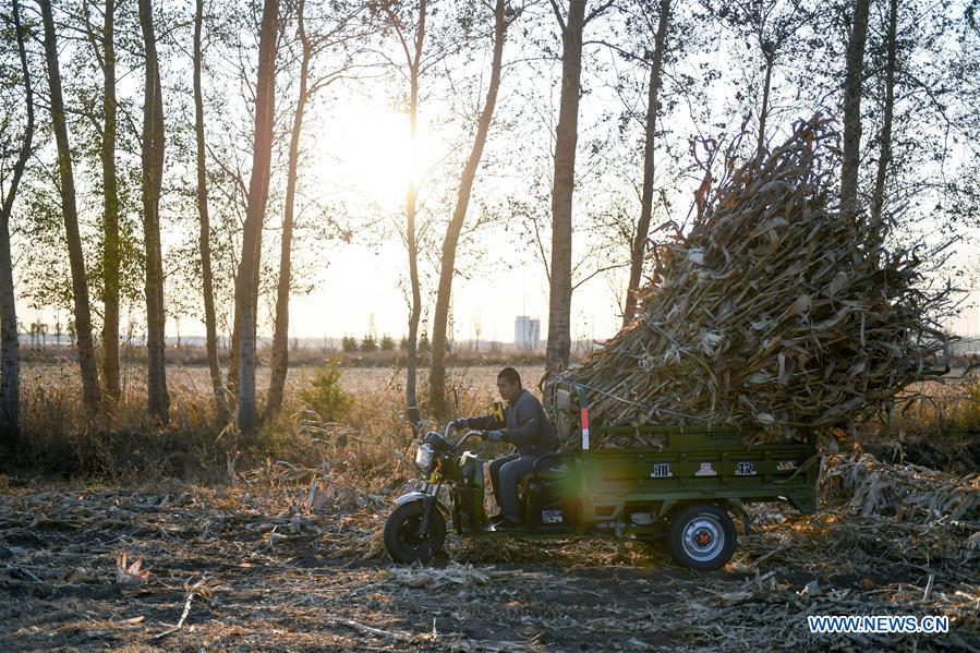 A farmer removes corn stovers in Sunjiatun Village of Nongan County, Changchun, northeast China's Jilin Province, Oct. 29, 2020. Jilin Province has entered the final phase of autumn harvest as agricultural producers finished gathering 96.3 percent of the season's crops. (Photo by Yan Linyun/Xinhua)