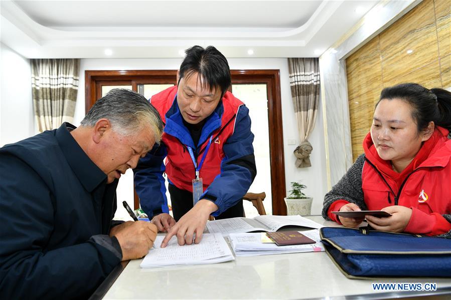 A resident signs as a census taker and an instructor register his information in Baokang County of Xiangyang, central China's Hubei Province, Nov. 1, 2020. China on Sunday started its seventh national population count, with about 7 million census takers going door to door to document demographic changes in the world's most populous country. (Photo by Yang Tao/Xinhua)