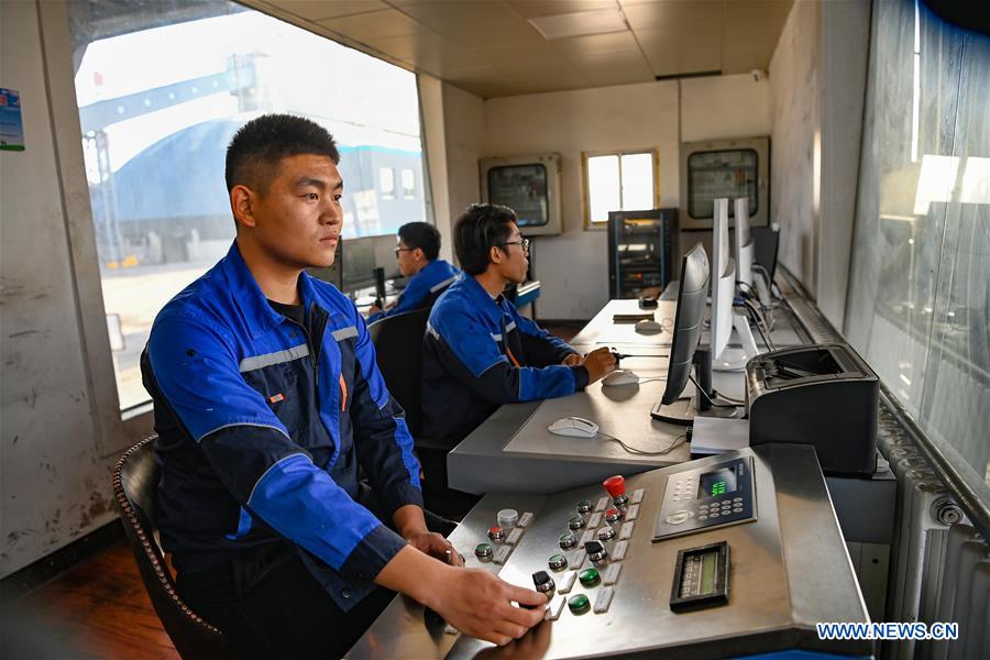 Workers load cargos with automatic equipment at Yulin Xiangdao International Logistics Park in Yulin City, northwest China's Shaanxi Province, Oct. 31, 2020. Since the operation in June of 2019, Xiangdao International Logistics Park has sent 16.87 million tonnes of goods, among which 96 percent were coal. (Xinhua/Tao Ming)