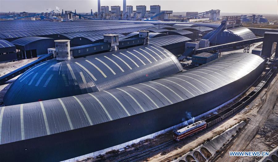 Aerial photo taken on Oct. 31, 2020 shows a freight train full of coal leaving Yulin Xiangdao International Logistics Park in Yulin City, northwest China's Shaanxi Province. Since the operation in June of 2019, Xiangdao International Logistics Park has sent 16.87 million tonnes of goods, among which 96 percent were coal. (Xinhua/Tao Ming)
