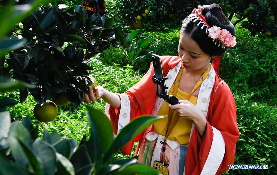 A tourist take photographs of green oranges at a demonstration base in Qiongzhong, south China's Hainan Province, Nov. 1, 2020. With a planting area of about 29,000 mu (about 1,933 hectares), the green orange output in Qiongzhong is expected to reach 5,000 tonnes. (Xinhua/Yang Guanyu)