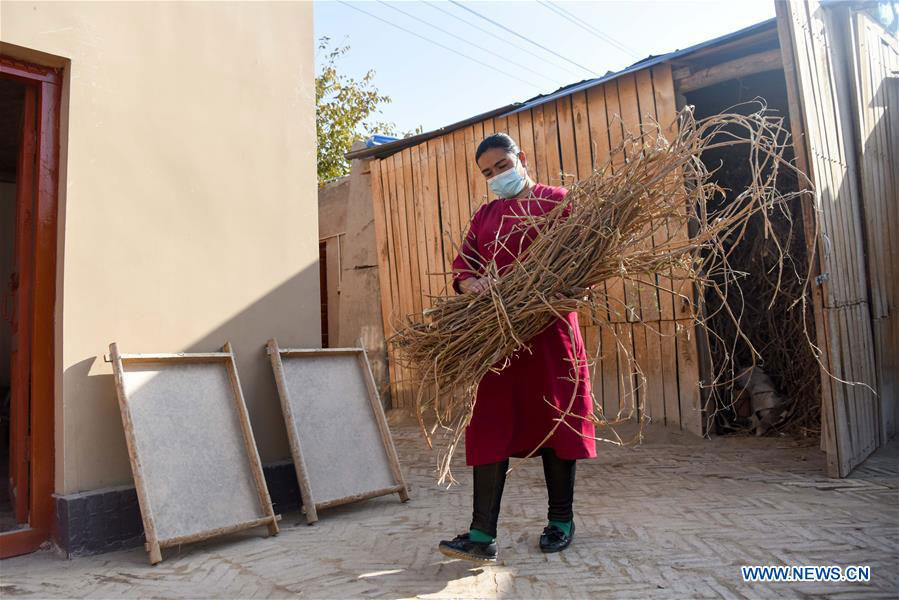 A craftswoman prepares materials to make mulberry-bark paper in Moyu County of Hotan, northwest China's Xinjiang Uygur Autonomous Region, Nov. 1, 2020. Mulberry-bark paper making, a craft of over 1,300 years of history, is listed as a Chinese national intangible cultural heritage. The paper boasts a quality of being antiseptic, absorbent and tensile. (Xinhua/Ding Lei)