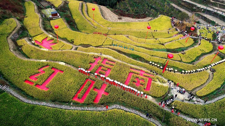 Aerial photo taken on Nov. 1, 2020 shows the scenery of terraced fields at Zhinan Village of Taihuyuan Town in Hangzhou, east China's Zhejiang Province. (Xinhua/Xu Yu)