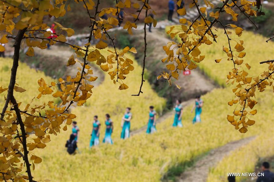 Photo taken on Nov. 1, 2020 shows the scenery of terraced fields and ginkgo trees at Zhinan Village of Taihuyuan Town in Hangzhou, east China's Zhejiang Province. (Xinhua/Xu Yu)