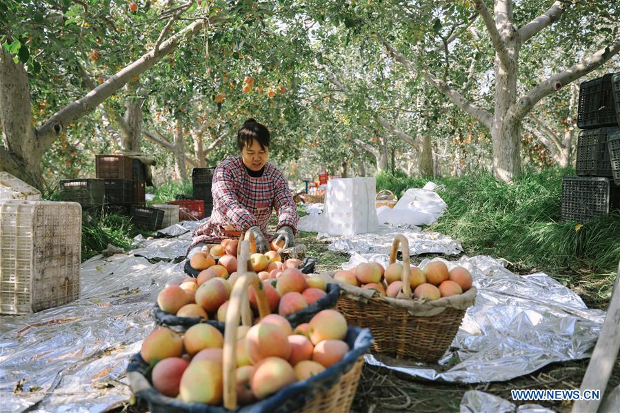 A farmer sorts apples at a garden in Aksu of northwest China's Xinjiang Uygur Autonomous Region, Oct. 31, 2020. Over 380,000 mu (about 25,333 hectares) of apples have entered harvest season in Aksu. (Xinhua/Zhang Man)
