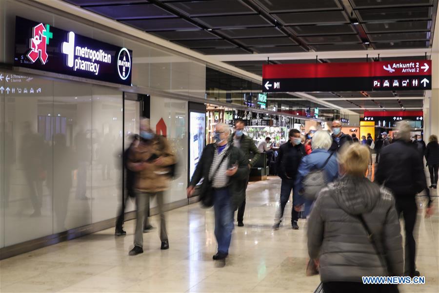 People walk at a shopping area of the newly-opened Berlin Brandenburg Airport in Schoenefeld, Germany, on Nov. 1, 2020. Following several delays, Berlin Brandenburg Airport opened to the public on Oct. 31. (Xinhua/Shan Yuqi)