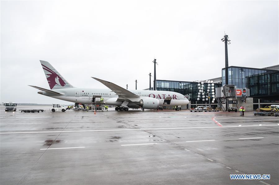 A Qatar Airways aircraft is seen at the newly-opened Berlin Brandenburg Airport in Schoenefeld, Germany, on Nov. 1, 2020. Following several delays, Berlin Brandenburg Airport opened to the public on Oct. 31. (Xinhua/Shan Yuqi)