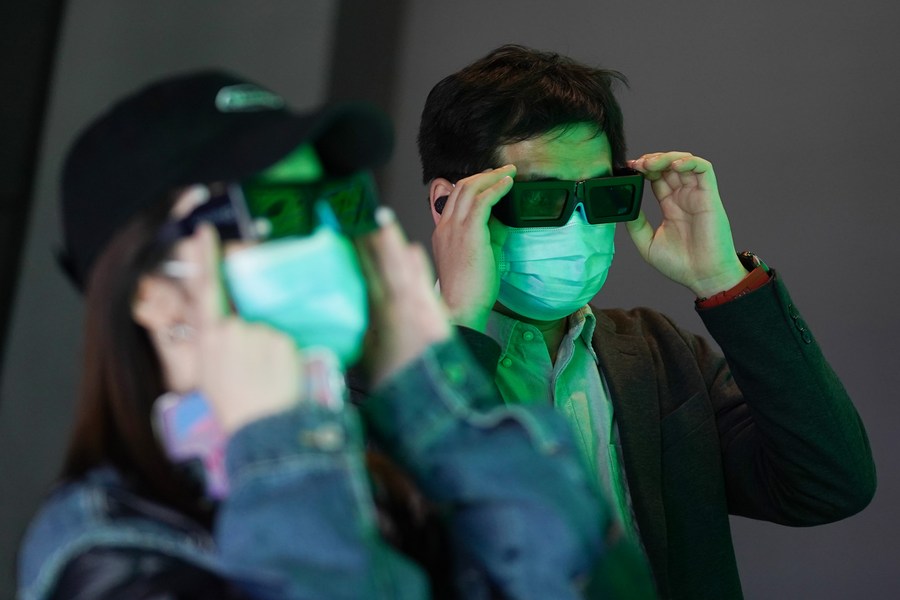 People try virtual simulation devices at a new technology and products exhibition during the 2020 China Science Fiction Conference in Beijing, capital of China, Nov. 11, 2020. (Xinhua/Ju Huanzong)