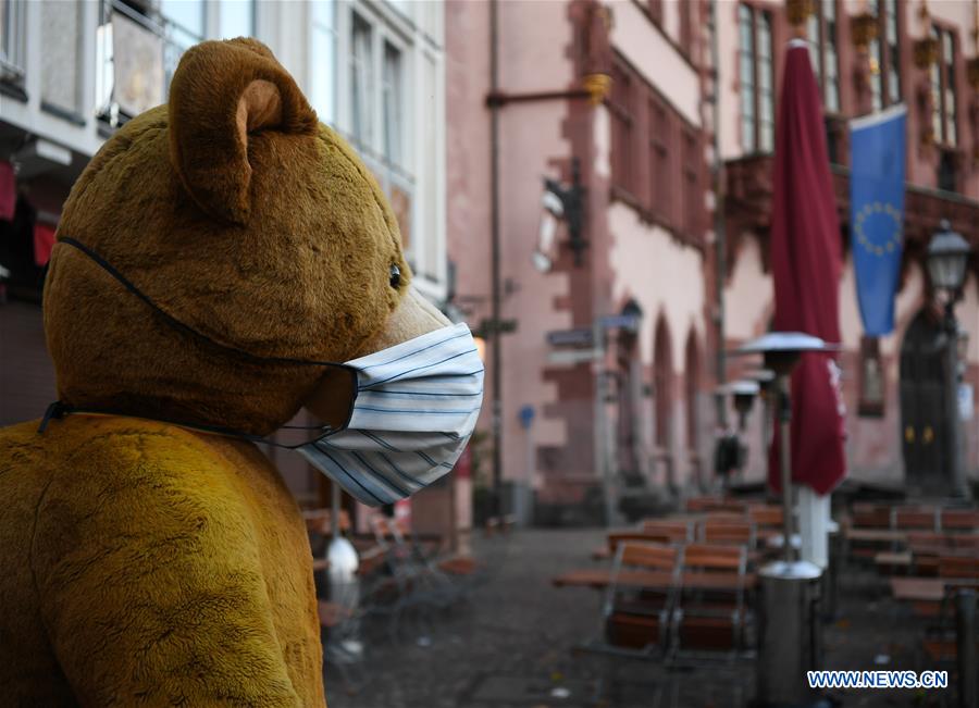 A masked teddy bear is seen in front of a souvenir shop on a square in Frankfurt, Germany, on Nov. 2, 2020. New COVID-19 infections in Germany increased by 12,097 within one day to a total of 545,027 as the country entered its second partial lockdown, the federal government agency for disease control and prevention Robert Koch Institute (RKI) announced on Monday. (Xinhua/Lu Yang)