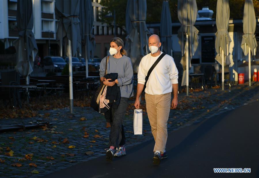 Two pedestrians wearing face masks walk on a street in Frankfurt, Germany, on Nov. 2, 2020. New COVID-19 infections in Germany increased by 12,097 within one day to a total of 545,027 as the country entered its second partial lockdown, the federal government agency for disease control and prevention Robert Koch Institute (RKI) announced on Monday. (Xinhua/Lu Yang)