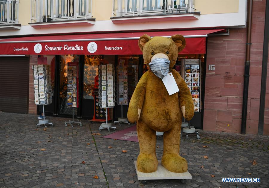 A masked teddy bear is seen in front of a souvenir shop on a square in Frankfurt, Germany, on Nov. 2, 2020. New COVID-19 infections in Germany increased by 12,097 within one day to a total of 545,027 as the country entered its second partial lockdown, the federal government agency for disease control and prevention Robert Koch Institute (RKI) announced on Monday. (Xinhua/Lu Yang)