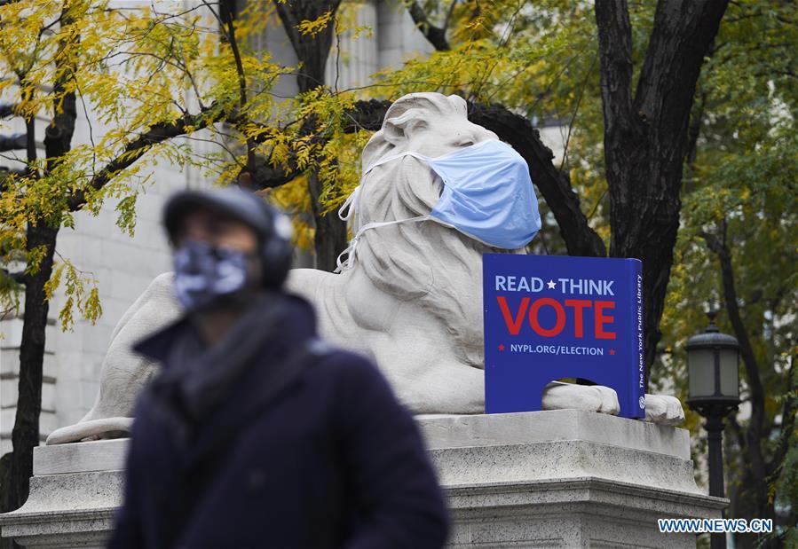 A pedestrian walks past an advertisement encouraging people to vote in the upcoming 2020 U.S. presidential election outside New York Public Library in New York, the United States, Nov. 2, 2020. (Xinhua/Wang Ying)