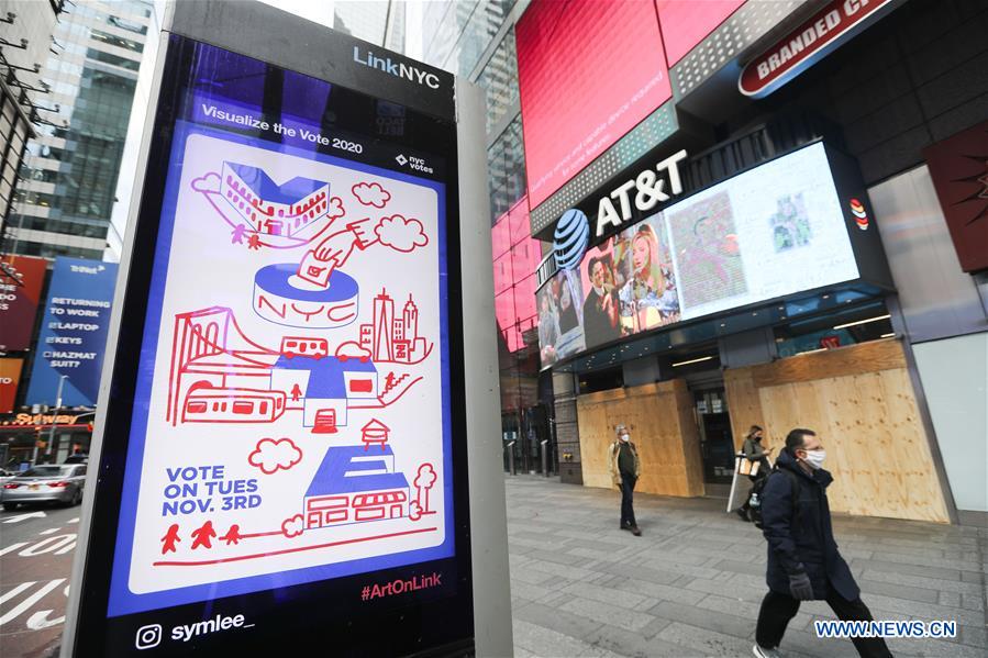 A pedestrian walks past an advertisement encouraging people to vote in the upcoming 2020 U.S. presidential election on Times Square in New York, the United States, Nov. 2, 2020. (Xinhua/Wang Ying)