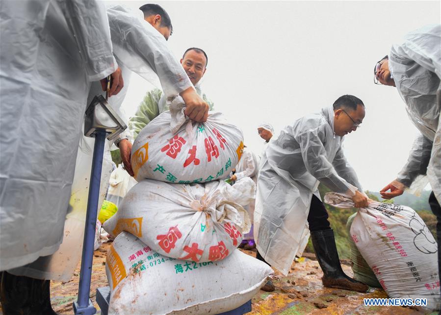 Staff members weigh the third-generation hybrid rice at an experimental demonstration field in Hengnan County, central China's Hunan Province, Nov. 2, 2020. The third-generation hybrid rice developed by Yuan Longping, the "father of hybrid rice," and his team achieved a yield of 911.7 kg per mu (about 667 square meters) in an experiment in central China's Hunan Province. (Xinhua/Chen Zeguo)