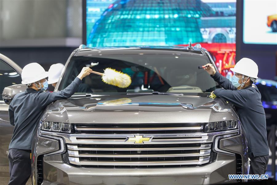 Staff members clean a vehicle at the automobile exhibition area of the 3rd China International Import Expo (CIIE) in east China's Shanghai, Nov. 2, 2020. The third CIIE will be held from Nov. 5 to 10 in Shanghai. (Xinhua/Ding Ting)