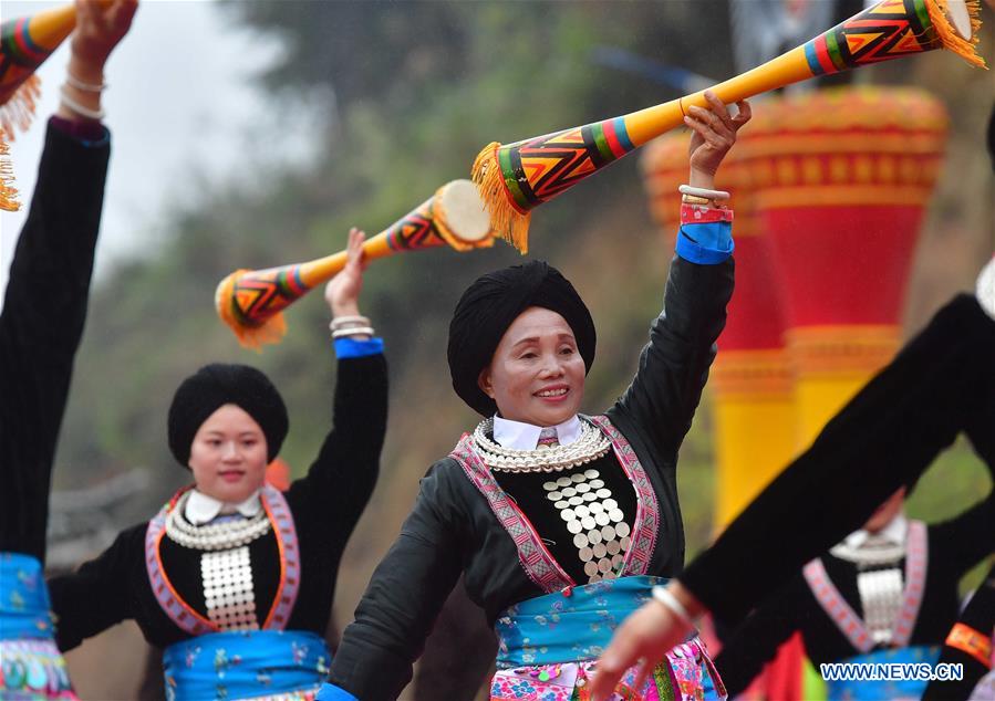 People of the Yao ethnic group dance during the folk Panwang Festival as well as a harvest festival in Rongshui Miao Autonomous County, south China's Guangxi Zhuang Autonomous Region, Nov. 1, 2020. (Xinhua/Huang Xiaobang)