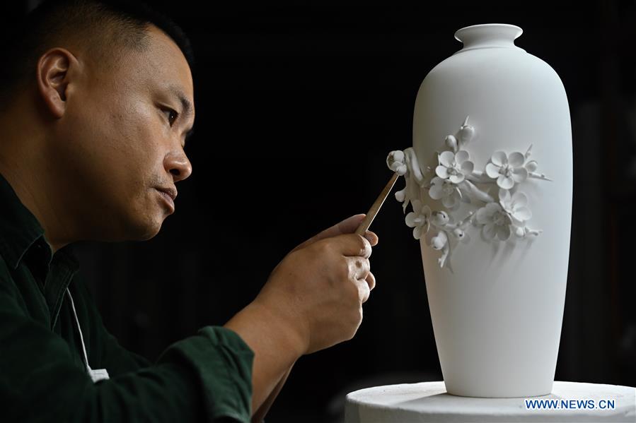 Artisan Xu Jinbao refines the earthen base of a white porcelain vase in Dehua County, Quanzhou, southeast China's Fujian Province, Oct. 20, 2020. A major porcelain-production center, Dehua in southeast China's Fujian Province has been making export porcelain since the Song Dynasty (960-1279 AD). The plain white porcelain crafted here was later dubbed "Blanc de Chine (White from China)" by the French and gained worldwide fame. As one of the traditional dragon kilns with long, thin and slightly sloped structures, the only remaining ancient kiln in Dehua is the Yueji Kiln, which has been burning continuously for more than 400 years. While the city preserves the ancient kiln, there are new-generation artisans seeking creativity on top of heritage. Xu Jinbao, who'd rather define himself as a "technical artisan", is among such innovators in the porcelain manufacturer circle of Dehua. After graduating from Shanghai Jiao Tong University with a degree in materials science, Xu returned to Dehua and set up a technology company which aims at finding improved ceramic solutions by making tweaks to the ingredients. Xu's ceramics products feature better heat-resistant, corrosion-proof and absorption performances than their older, traditional counterparts. He and colleagues have already debuted ceramic kettles which work on direct heat, and ceramic filters for water purifiers will be introduced soon. Like Xu Jinbao and his company, a growing number of Dehua-based porcelain enterprises have optimized production via technical upgrades, securing orders with a continuous supply of state-of-the-art, quality "Blanc de Chine" to global clients. (Xinhua/Song Weiwei)
