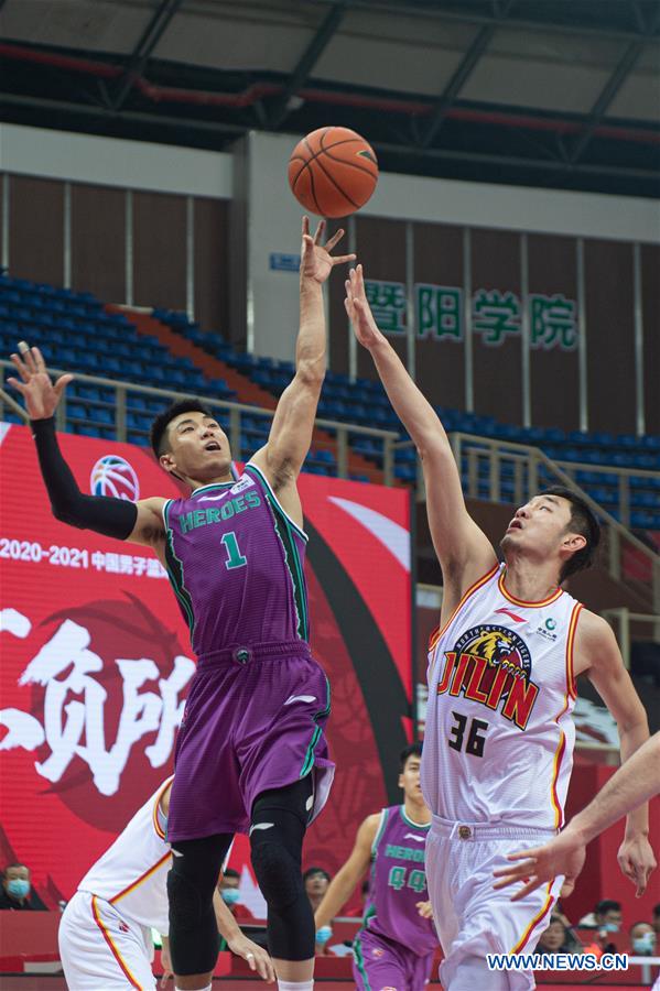 Gao Shiyan (L) of Shandong Heroes goes up for a basket during the 7th round match between Jilin Northeast Tigers and Shandong Heroes at the 2020-2021 season of the Chinese Basketball Association (CBA) league in Zhuji, east China's Zhejiang Province, Nov. 2, 2020. (Xinhua/Jiang Han)
