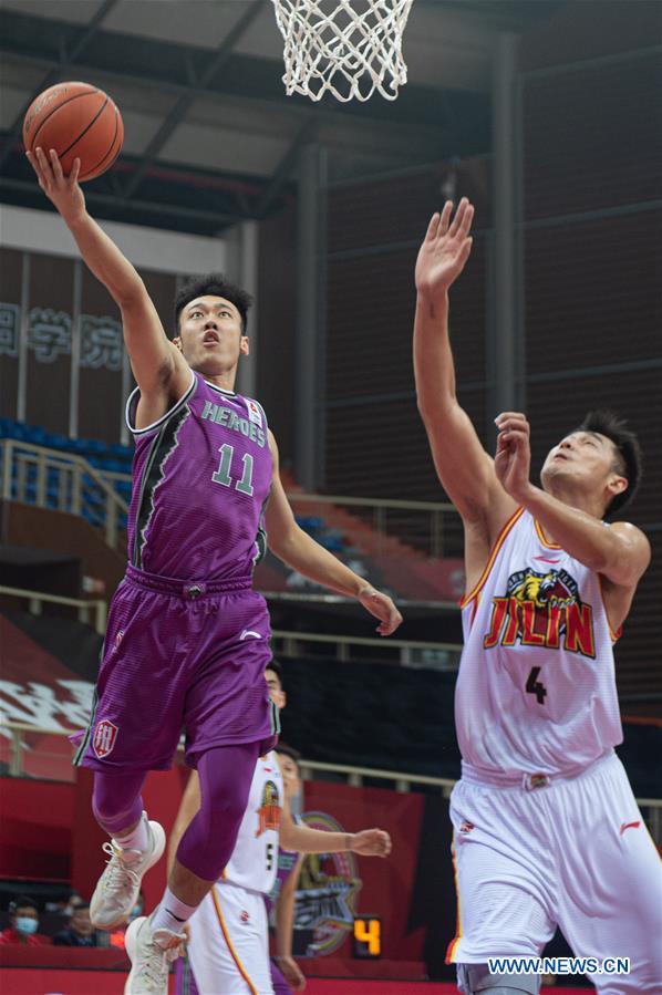Wang Wenyu (L) of Shandong Heroes goes up for a basket during the 7th round match between Jilin Northeast Tigers and Shandong Heroes at the 2020-2021 season of the Chinese Basketball Association (CBA) league in Zhuji, east China's Zhejiang Province, Nov. 2, 2020. (Xinhua/Jiang Han)