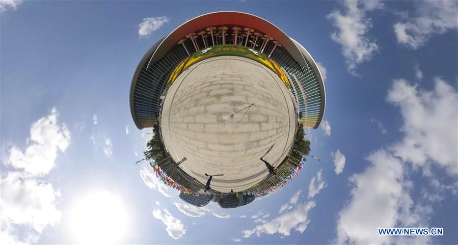 The panoramic photo taken on Nov. 3, 2020 shows the south square of the National Exhibition and Convention Center (Shanghai), a main venue for the third China International Import Expo (CIIE) in east China's Shanghai. The third CIIE will be held from Nov. 5 to 10 in Shanghai. (Xinhua/Zhang Haofu)