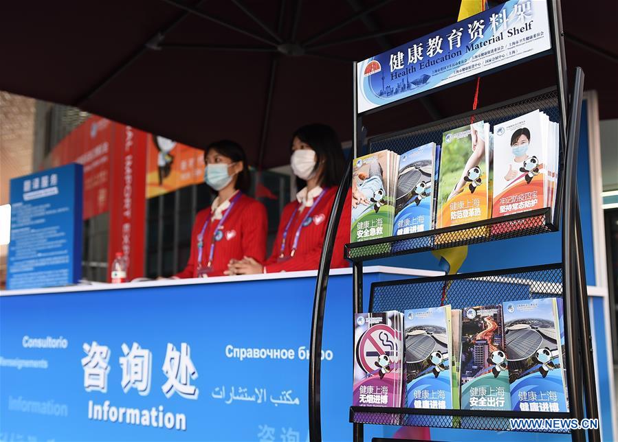 Volunteers work at an information desk of the National Exhibition and Convention Center, a main venue for the third China International Import Expo (CIIE), in east China's Shanghai, Nov. 3, 2020. The third CIIE will be held from Nov. 5 to 10 in Shanghai. (Xinhua/Zhao Dingzhe)