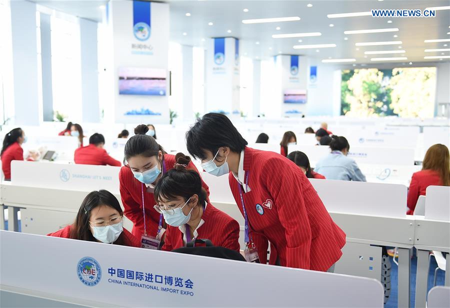 Volunteers work at the media center of the third China International Import Expo (CIIE) in Shanghai, east China, Nov. 3, 2020. (Xinhua/Zhao Dingzhe)