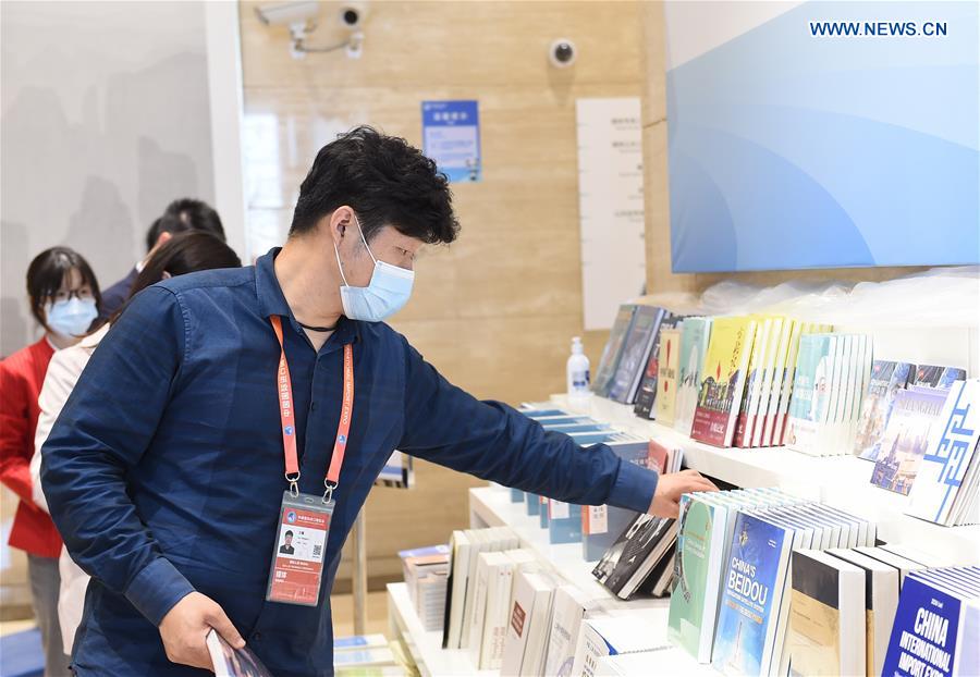 A reporter selects books at the media center of the third China International Import Expo (CIIE) in Shanghai, east China, Nov. 3, 2020. (Xinhua/Zhao Dingzhe)
