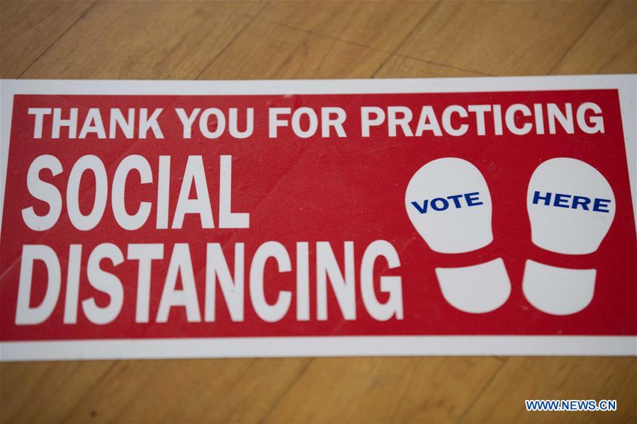 Photo taken on Nov. 3, 2020 shows a social distancing sticker at a polling station in Washington, D.C., the United States. Voting on Election Day is underway across the United States, as the COVID-19 pandemic is raging on and political divide running deeper. (Xinhua/Liu Jie)