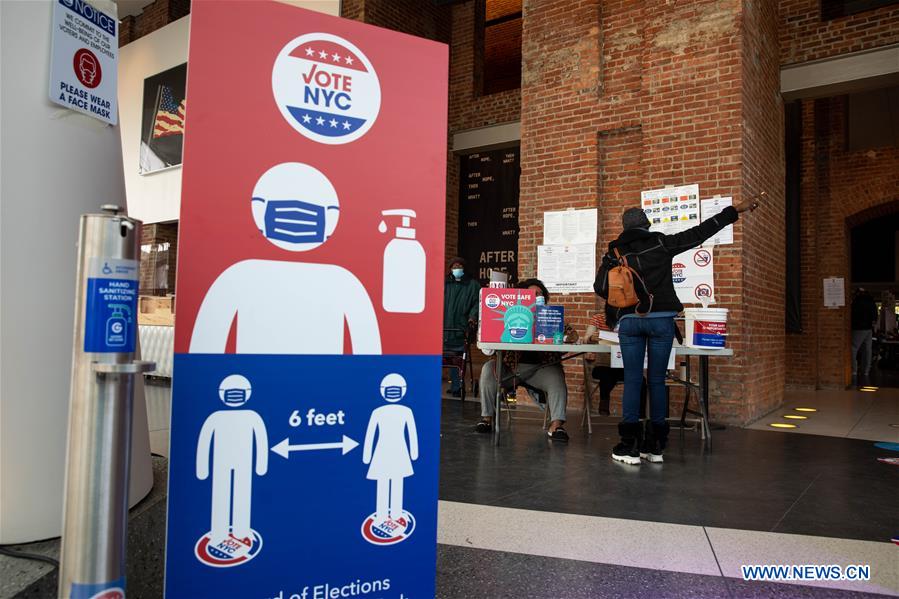 Staff members assist a voter at a polling station in Brooklyn borough of New York, the United States, on Nov. 3, 2020. Voting on Election Day is underway across the United States, as the COVID-19 pandemic is raging on and political divide running deeper. (Photo by Michael Nagle/Xinhua)