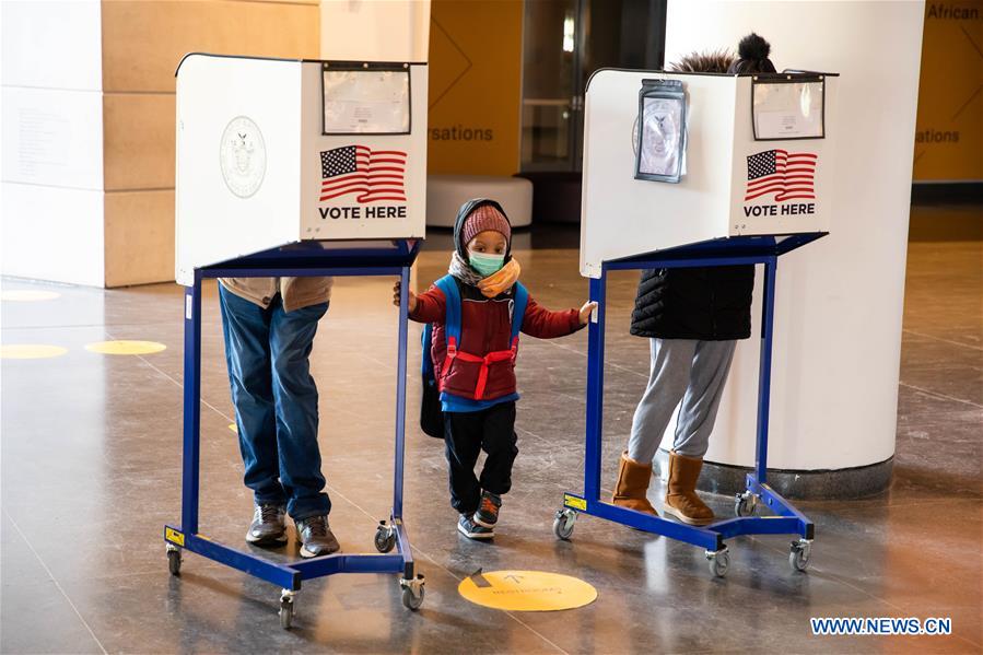 Voters cast their ballots at a polling station in Brooklyn borough of New York, the United States, on Nov. 3, 2020. Voting on Election Day is underway across the United States, as the COVID-19 pandemic is raging on and political divide running deeper. (Photo by Michael Nagle/Xinhua)