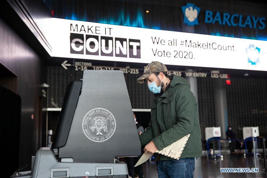 A voter scans his ballot at a polling station in Brooklyn borough of New York, the United States, on Nov. 3, 2020. Voting on Election Day is underway across the United States, as the COVID-19 pandemic is raging on and political divide running deeper. (Photo by Michael Nagle/Xinhua)