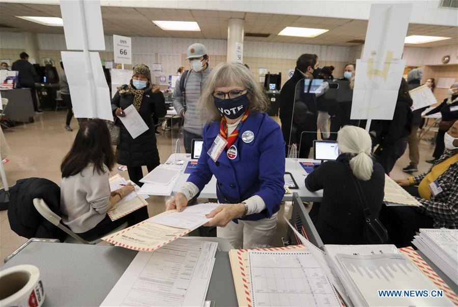 A staff member works at a polling station in New York, the United States, Nov. 3, 2020. Voters in major cities along the east coast of the United States started to cast their ballots early Tuesday, as polls continue to open across the country to decide the presidency. (Xinhua/Wang Ying)