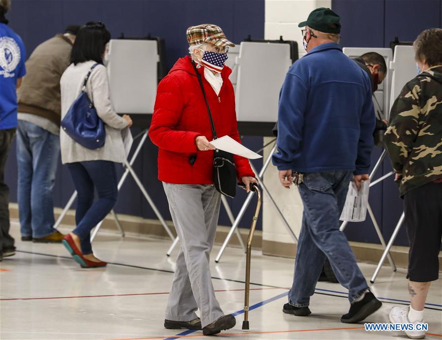 Voters are seen at a polling station in Kenosha, Wisconsin, the United States, on Nov. 3, 2020. Voting on Election Day is underway across the United States, as the COVID-19 pandemic is raging on and political divide running deeper. (Photo by Joel Lerner/Xinhua)